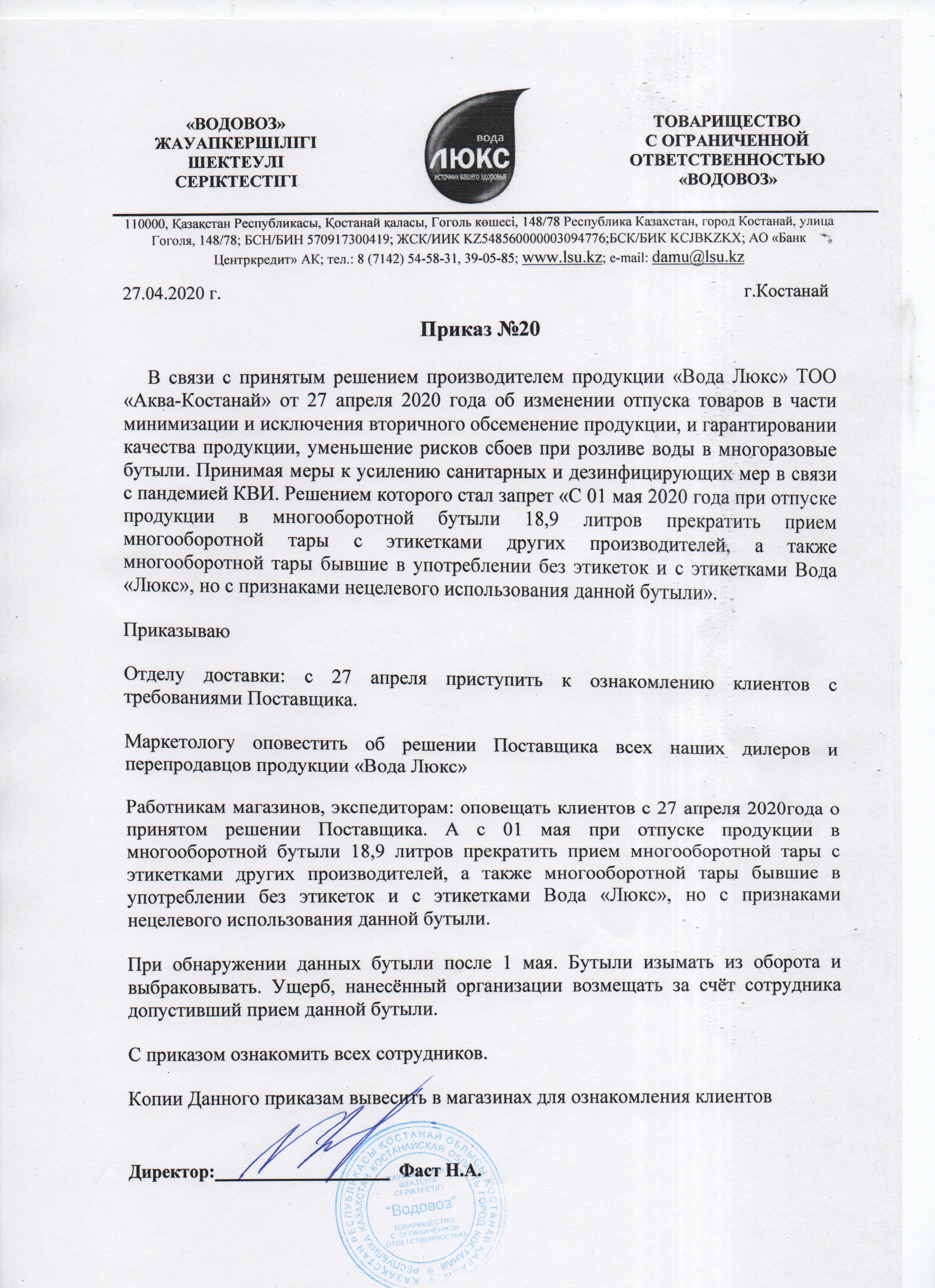 Вода «Люкс» уделяет повышенное внимание всем этапам производства своей продукции, и тара является немаловажной составляющей нашей продукции. Мы придерживается того принципа, что качественная тара — залог безопасности и долговременного сохранения полезных свойств питьевой воды. Поэтому для Воды «Люкс» мы закупаем специальные брендированные поликарбонатные баллоны, и стремиться использовать только свою поликарбонатную тару в обращении, выводя из обращения и не принимая в оборот тару не нашего производителя.